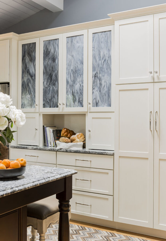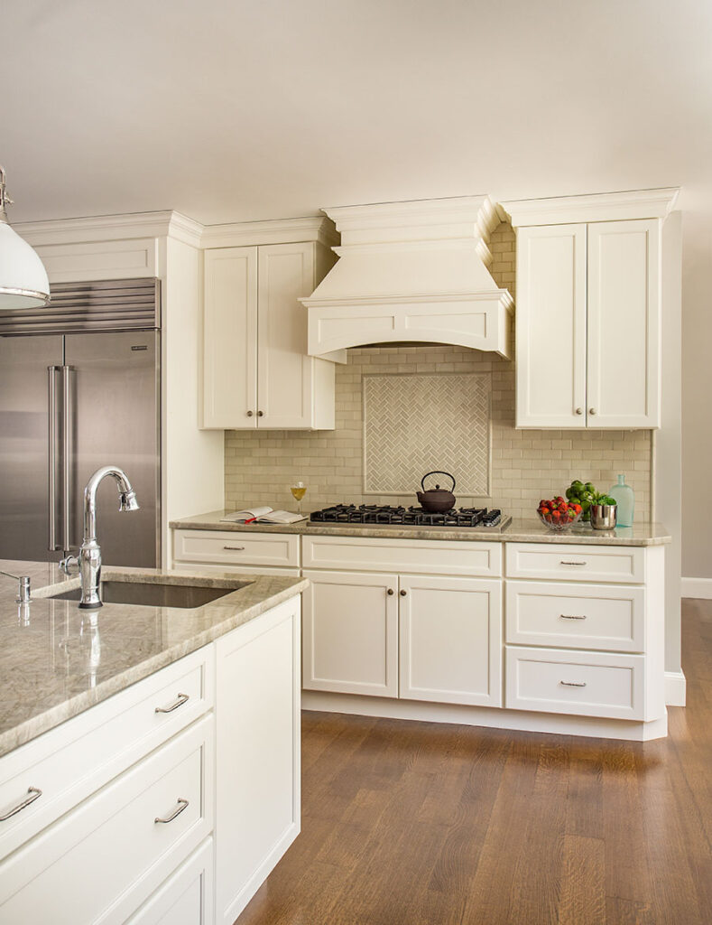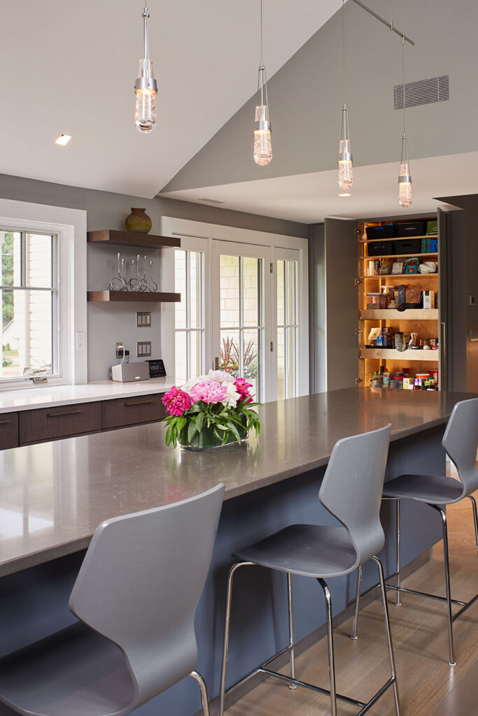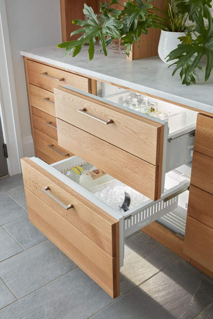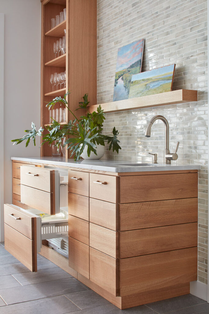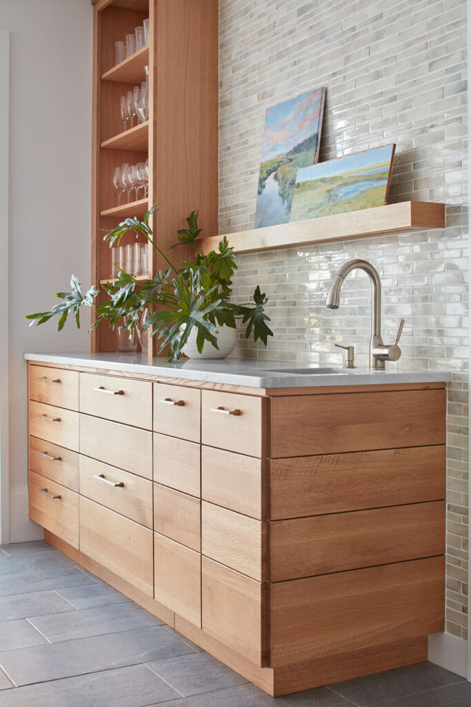 Full overlay painted Maple cabinetry in standard sheen on perimeter, 5-piece drawer fronts, dovetailed drawer construction and soft-close concealed door hinges. The custom 14’ 6” long island in ¼ Sawn White Oak accommodates a sink, dishwasher, trash compactor, microwave, double trash roll out and electrical outlets for convenience. This island can seat eight comfortably and is the perfect spot for guests to congregate.
