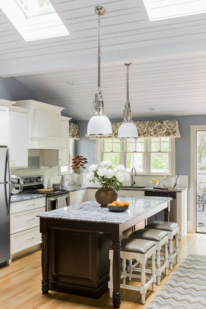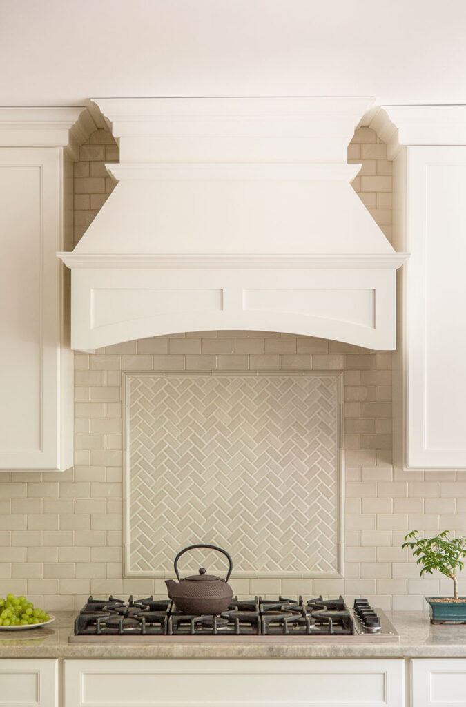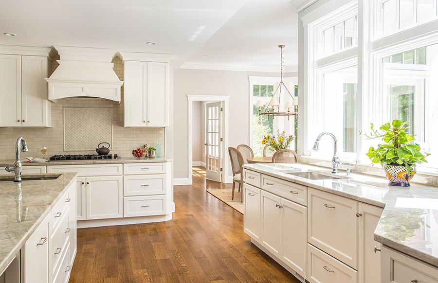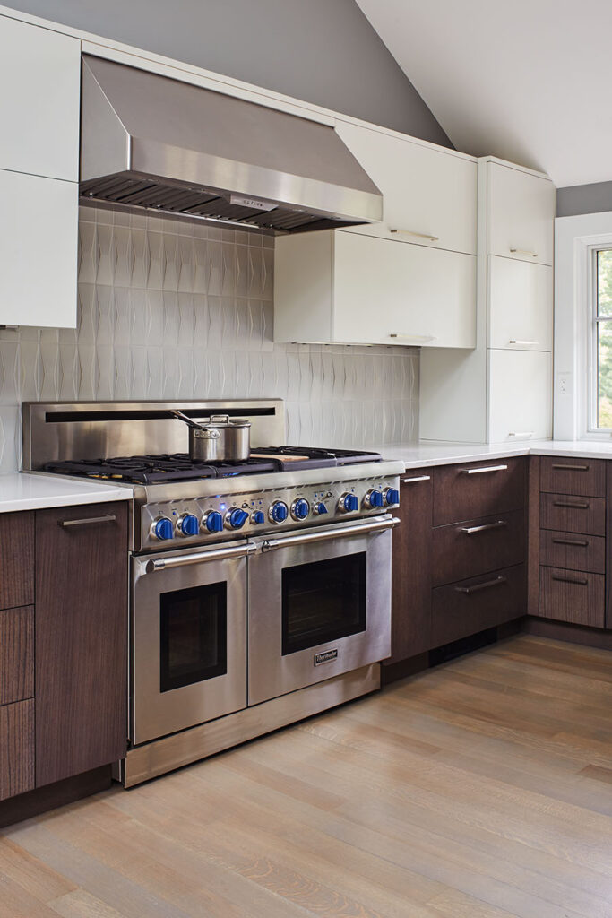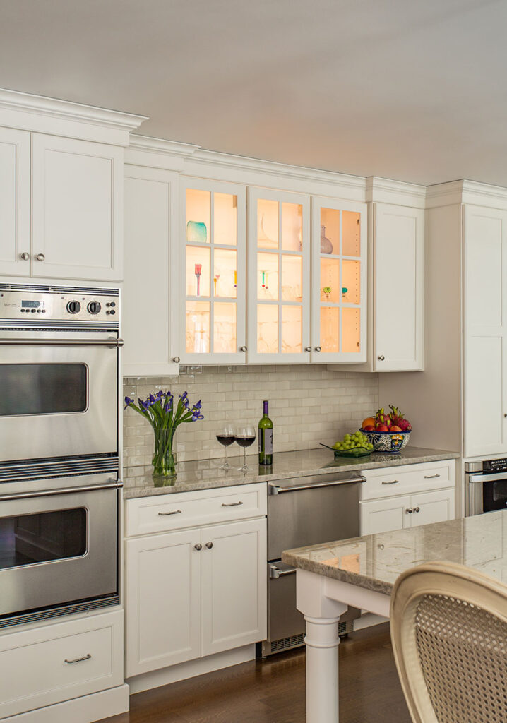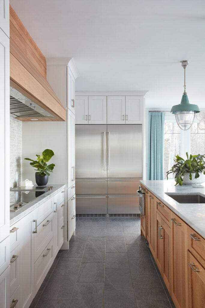 Full overlay painted Maple cabinetry in standard sheen on perimeter, 5-piece drawer fronts, dovetailed drawer construction and soft-close concealed door hinges. The custom 14’ 6” long island in ¼ Sawn White Oak accommodates a sink, dishwasher, trash compactor, microwave, double trash roll out and electrical outlets for convenience. This island can seat eight comfortably and is the perfect spot for guests to congregate.