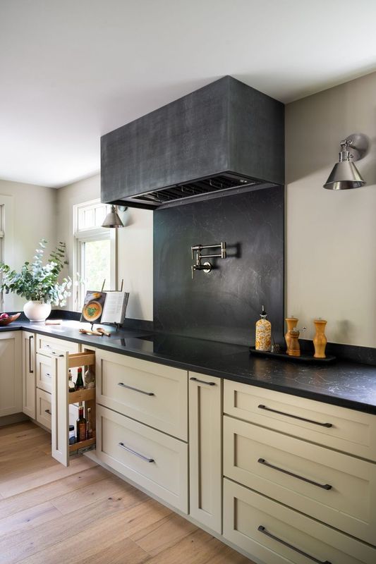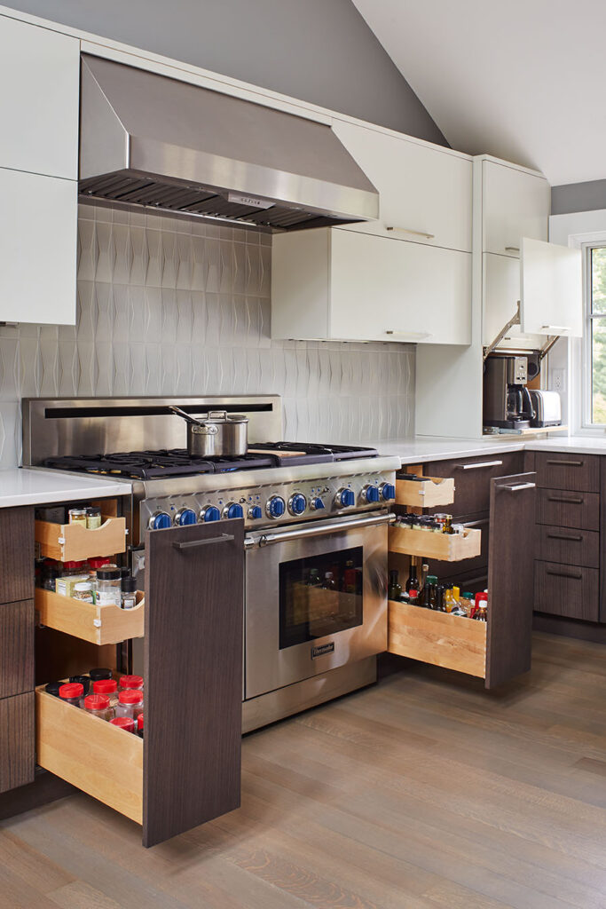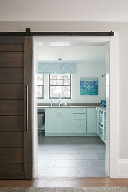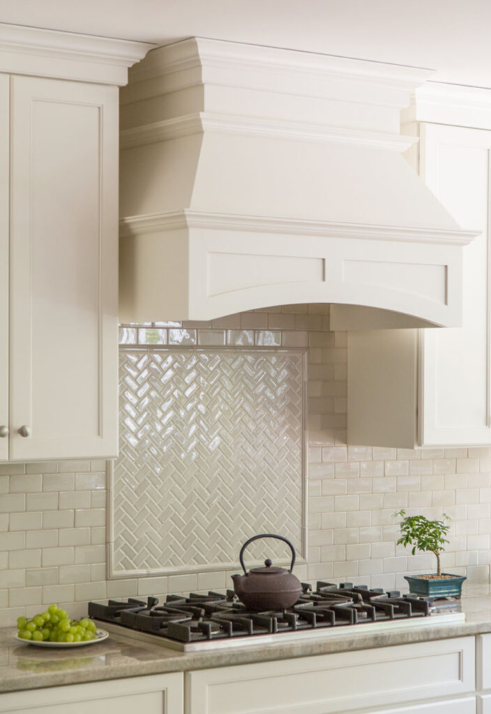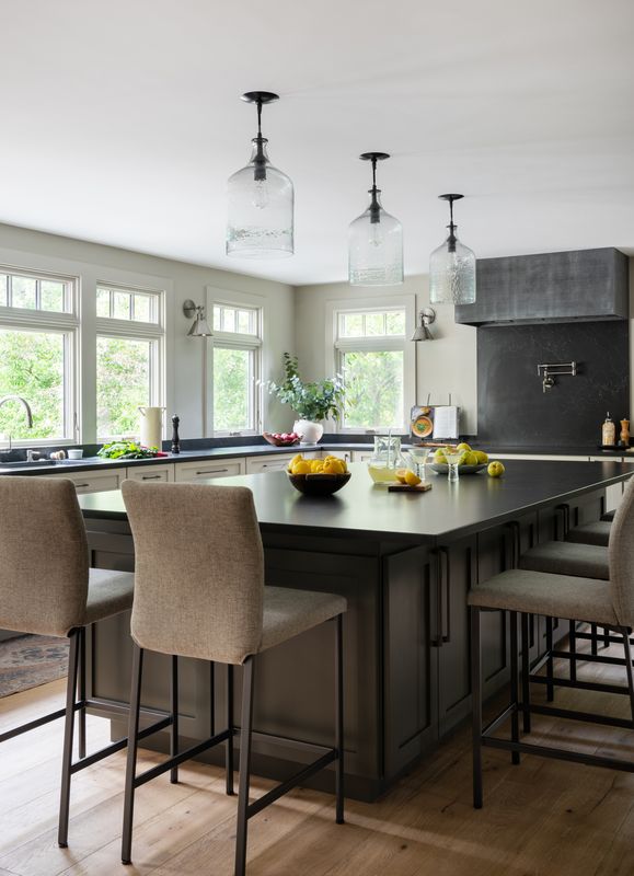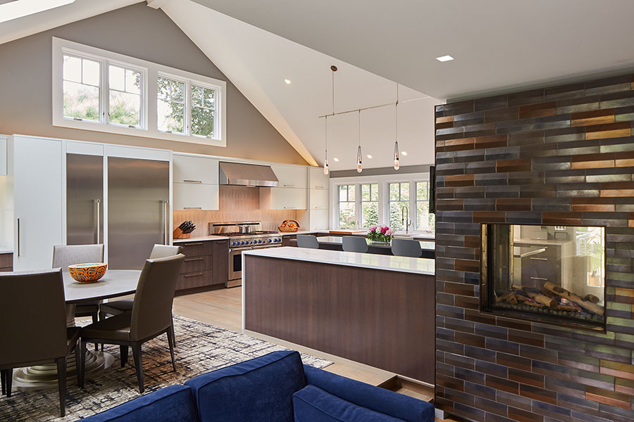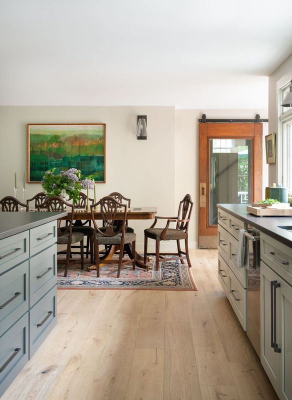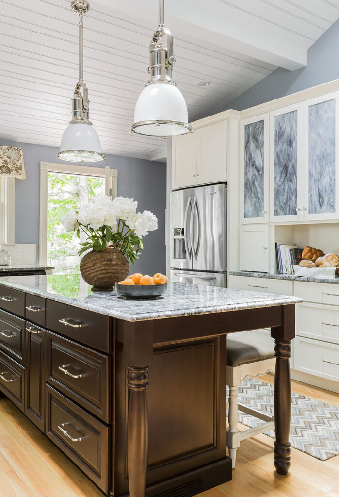 Full overlay painted Maple cabinetry in standard sheen on perimeter, 5-piece drawer fronts, dovetailed drawer construction and soft-close concealed door hinges. The custom 14’ 6” long island in ¼ Sawn White Oak accommodates a sink, dishwasher, trash compactor, microwave, double trash roll out and electrical outlets for convenience. This island can seat eight comfortably and is the perfect spot for guests to congregate.